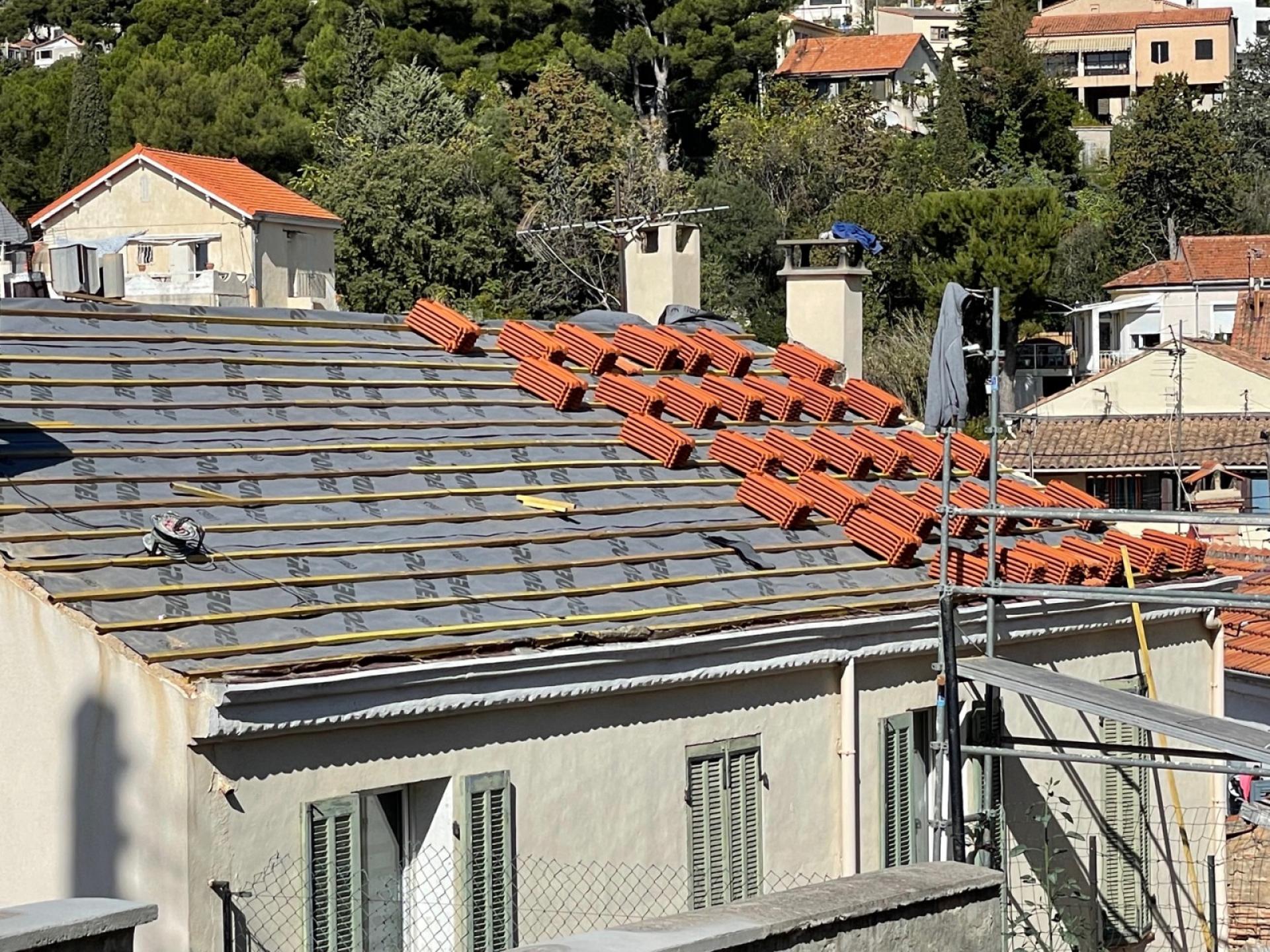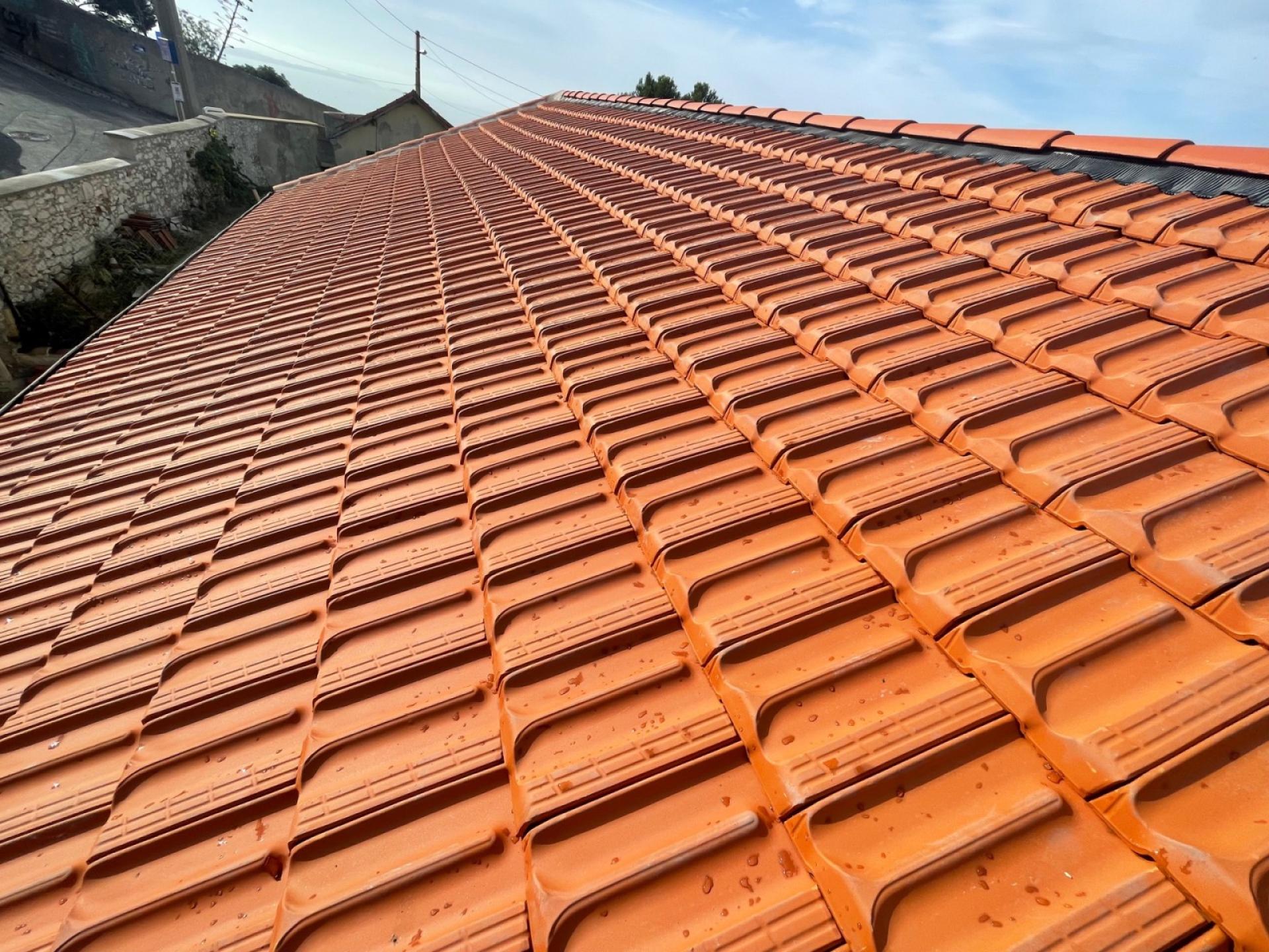 - Pose des premières tuiles mécaniques plates de Marseille rouge.