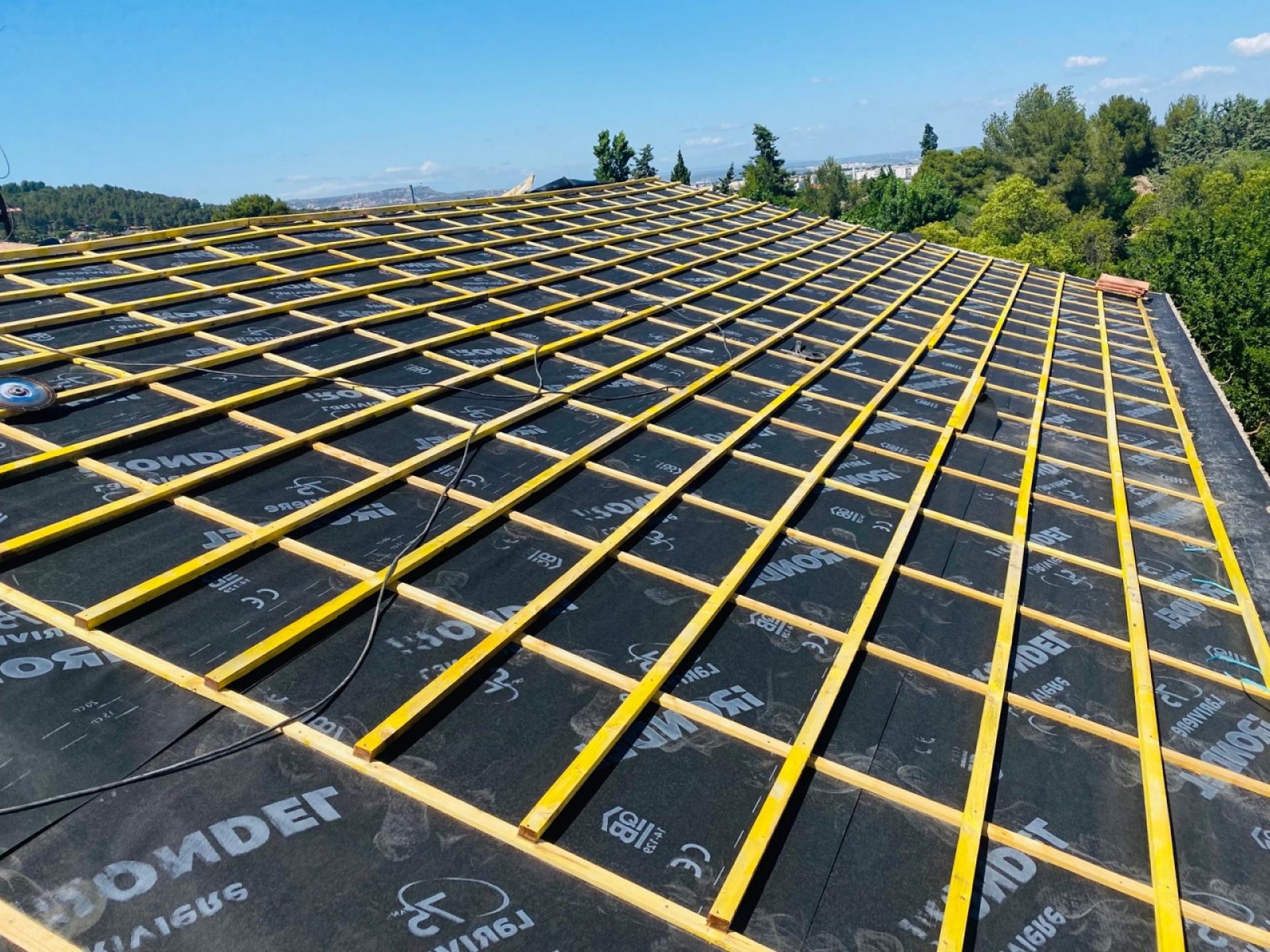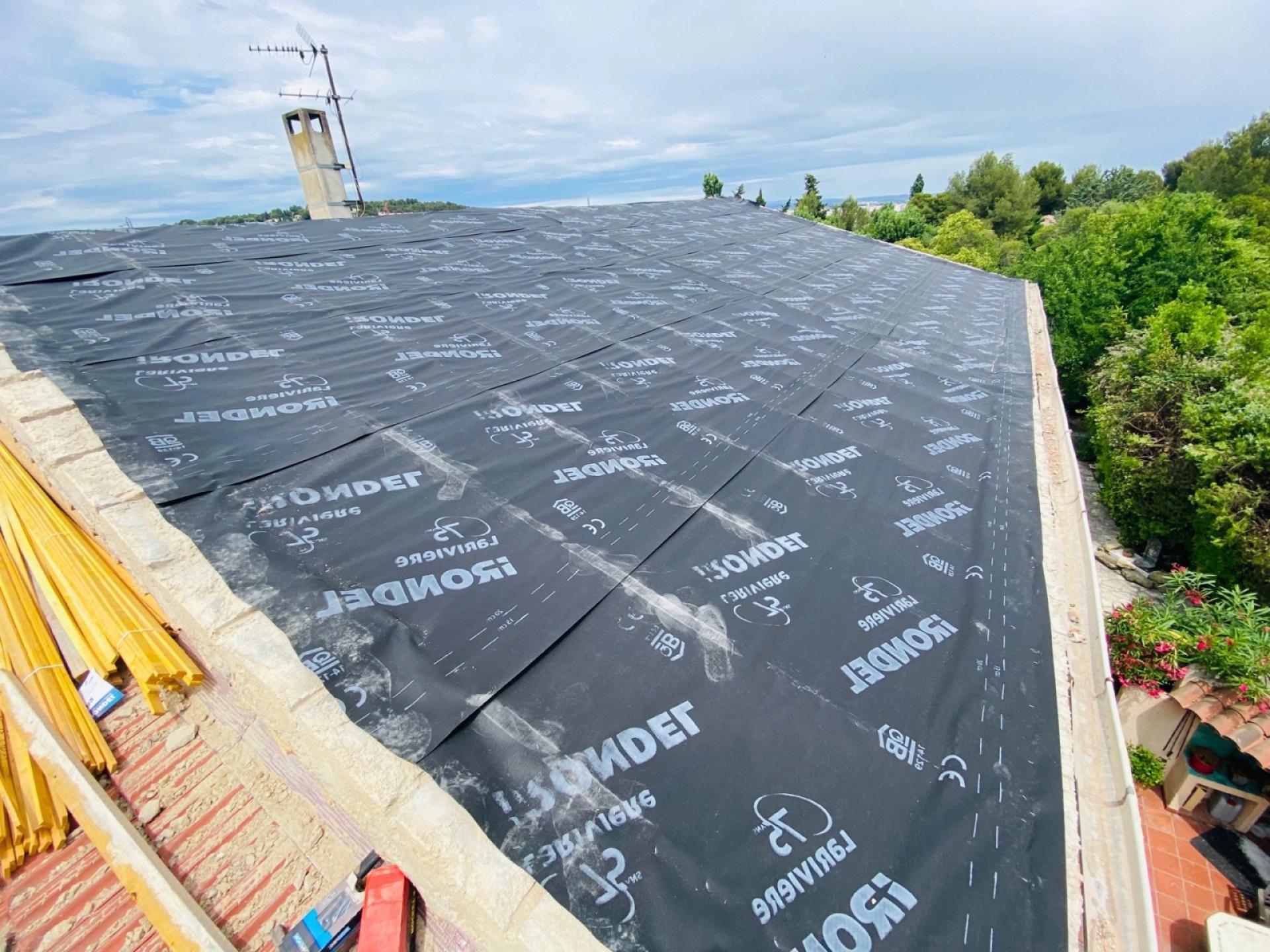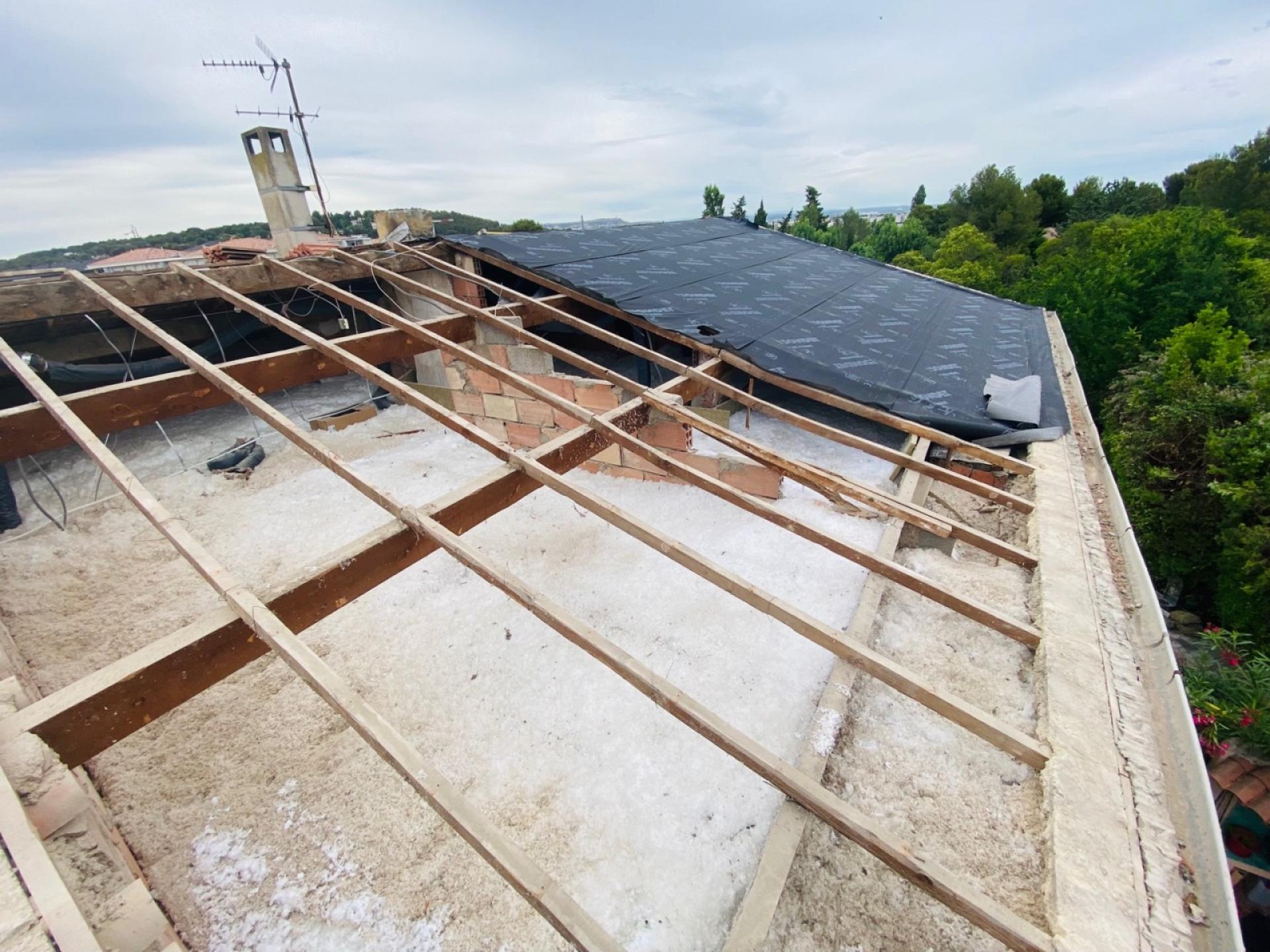 - Dépose du restant de toiture et évacuation des tuiles avec pose de l’écran sous toiture.