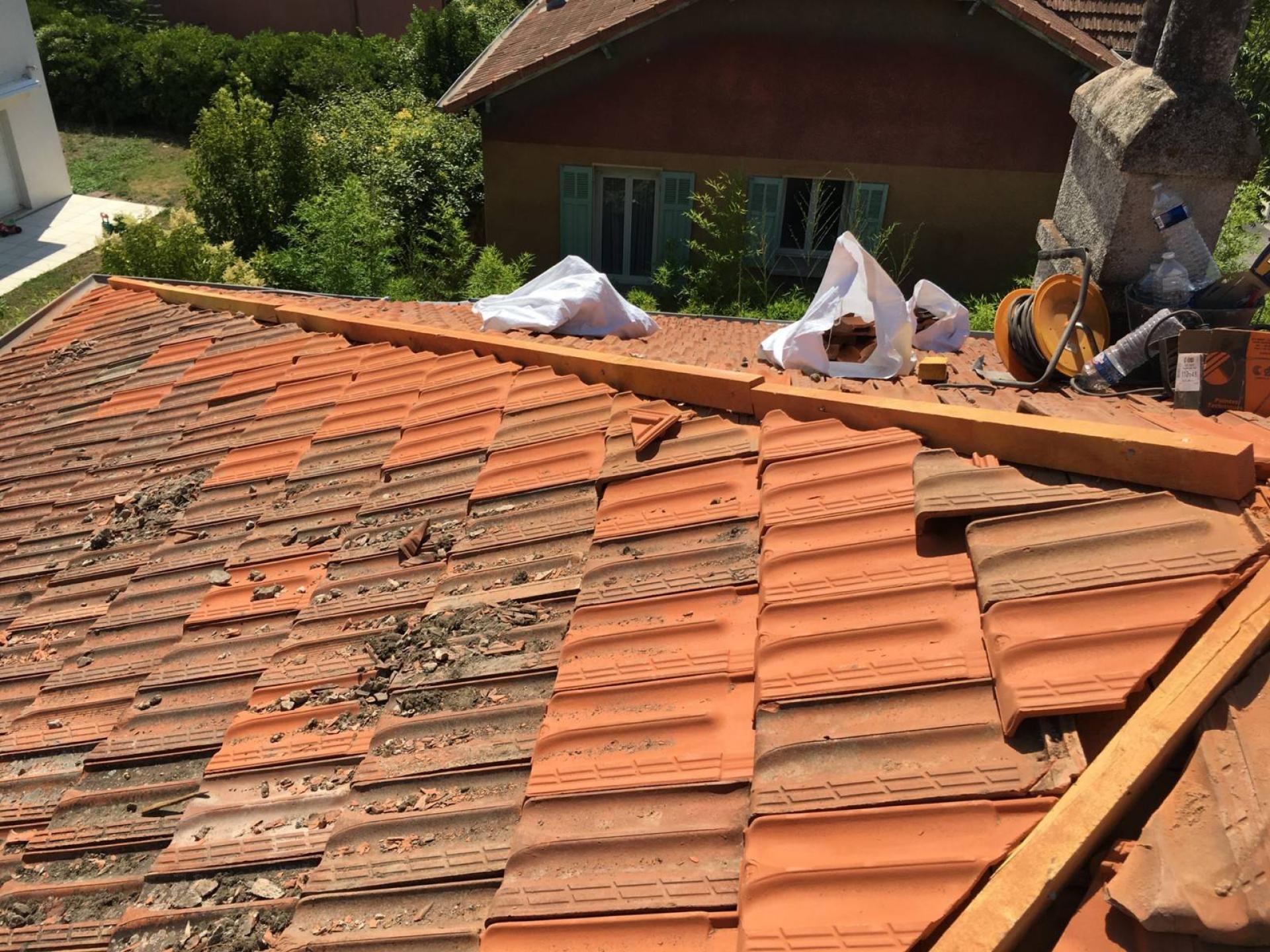 - Nous avons commencé par la dépose de l’ensemble des faîtages comprenant l’Embarrure ciment et tuiles faitière et sous- faitière avec évacuation des gravats le tout sur une hauteur de travail de 10 m.